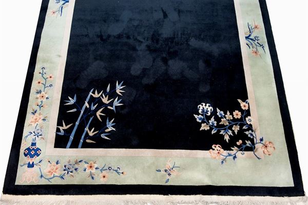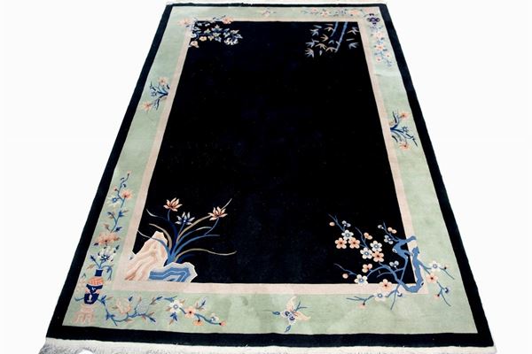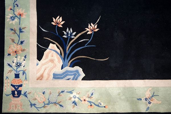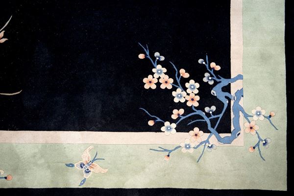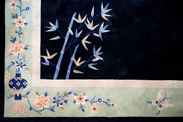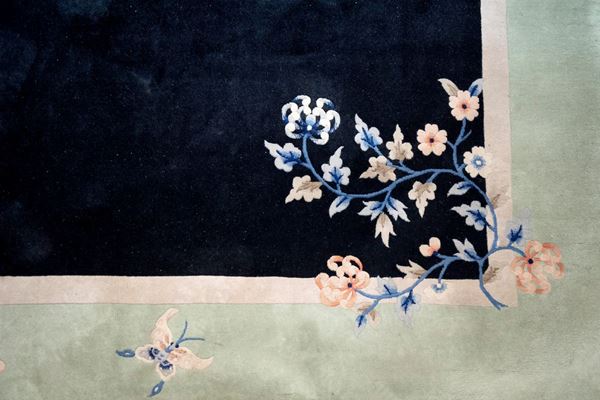 a fondo acquamarina e blu cobalto, con decorazioni floreali agli angoli.
