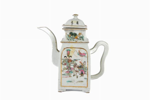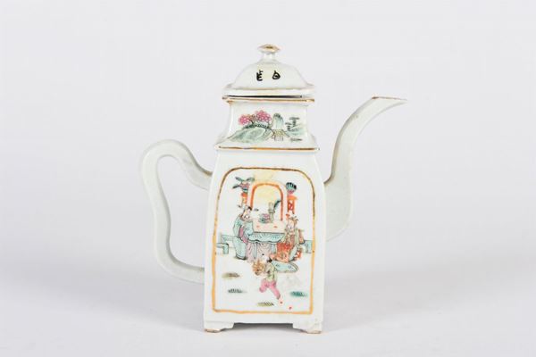 In porcellana bianca quadrangolare, ansa a orecchio di elefante e versatoio a collo di giraffa, con scene di genere all’orientale entro riserve in oro.