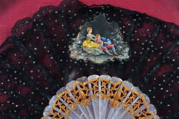 in pizzo nero con stecche in bachelite bianca in bacheca in legno dorato a mezzaluna.