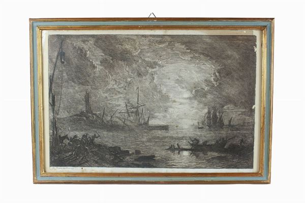 Opera tratta da "diverse compositioni e vedute inventate ed intagliate da Adriano Manglard L'an 1753".Gore di umidità e foxing presenti su tutta la superificie. Entro cornice.