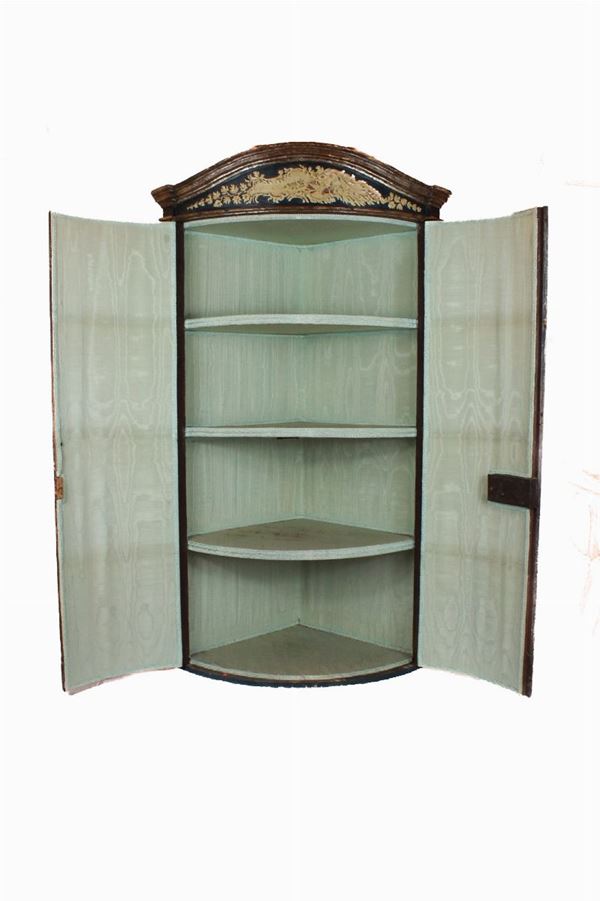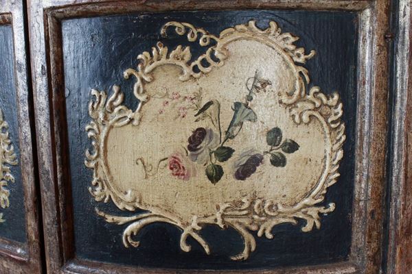 In legno argentato con formelle in legno laccato e decorato a motivi floreali. Due ante. Restauri e difetti.