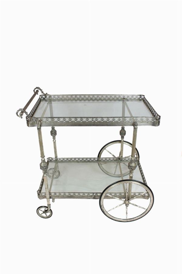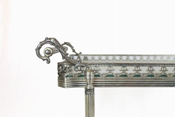 In metallo argentato, di forma rettangolare, a due ripiani, con bordi traforati. Parti ossidate.