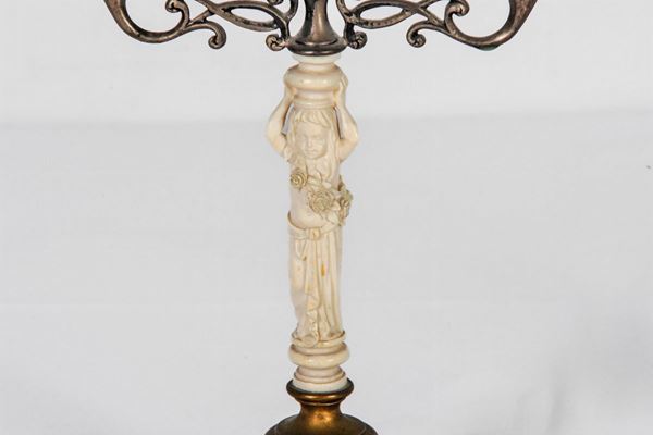 A 2 luci, con corpo muliebre in avorio scolpito. Base e braccia in bronzo. Finiture a rilievo floreale.