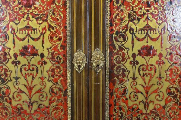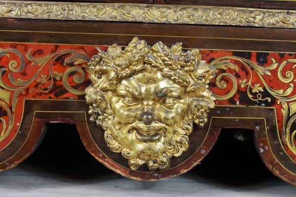 In legno ebanizzato con intarsi in ottone ed inserti in tartaruga, piano superiore in nero di Belgio, con decorazioni in bronzo dorato. Restauri e mancanze.
