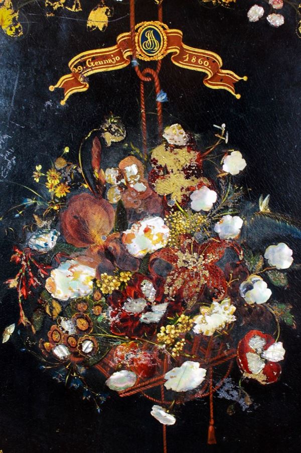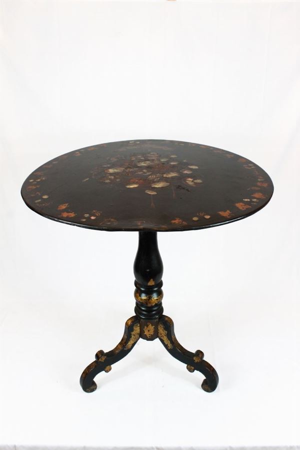 In legno. A 3 piedi di appoggio, fusto al tornio con piede circolare in lacca nera. Decori floreali e tarzie sul piano in oro e madreperla. Datato 29 gennaio 1860.