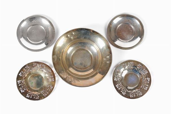 Composto da 4 piattini e una ciotola. Parti incise e traforate. Peso: 152 gr