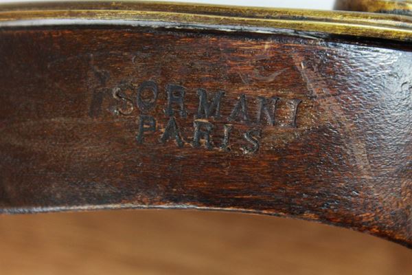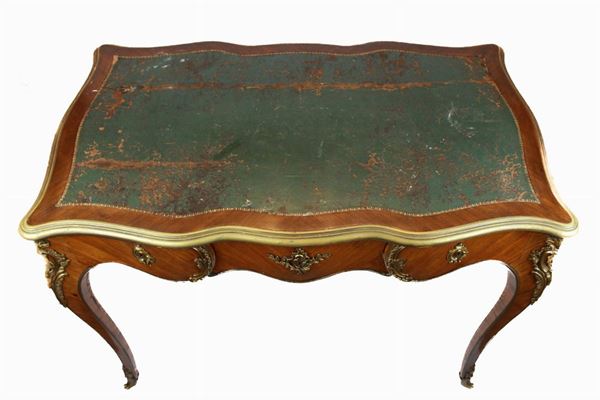 In mogano e piuma di mogano. Gambe a virgola, piano centinato a tre cassetti, finiture in bronzo cesellato e dorato. Piano in pelle verde lacerata in più punti. Firmato 'Sormani Paris' su un cassetto.