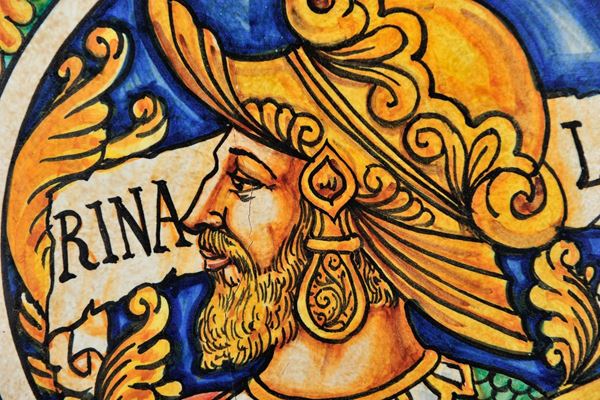 Coppia di effigi su ceramica policroma. In cornice lignea a patina bruna. Una mattonella presenta una felatura orizzontale.