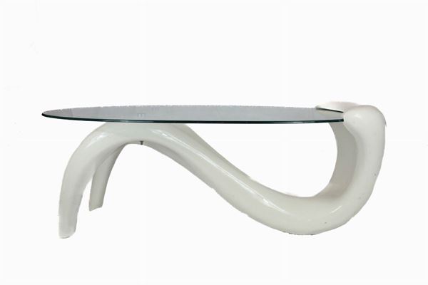 Di Tomasucci Design, con piano in vetro temprato e base in resina verniciata di bianco lucido, a tre punti d'appoggio.