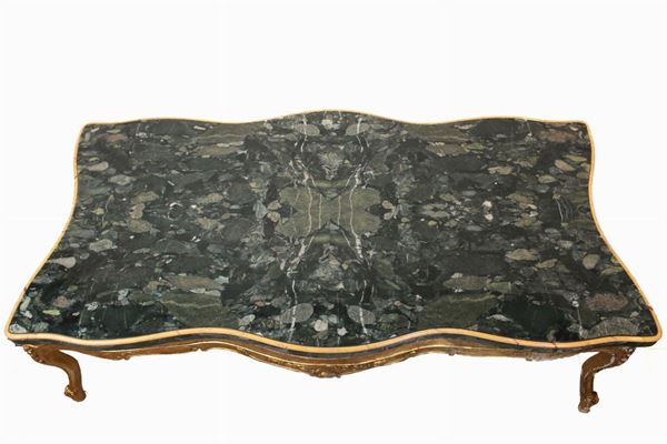 In legno dorato e intagliato, con gambe arcuate di linea Luigi XV. Piano superiore in marmo verde antico e centinato.