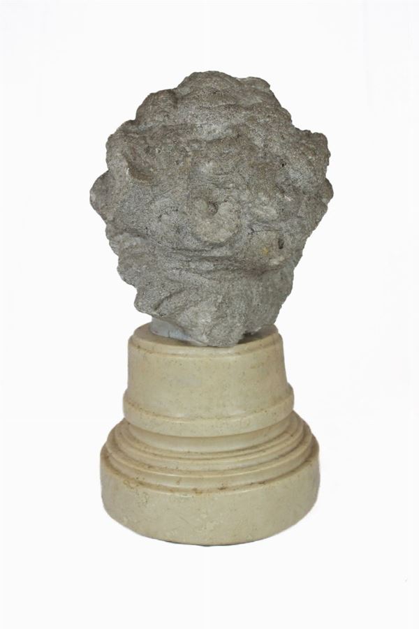 Scultura in volume, in peperino grigio materiale lapideo su base in marmo botticino color cremisi, mancanza sulla fronte del putto
