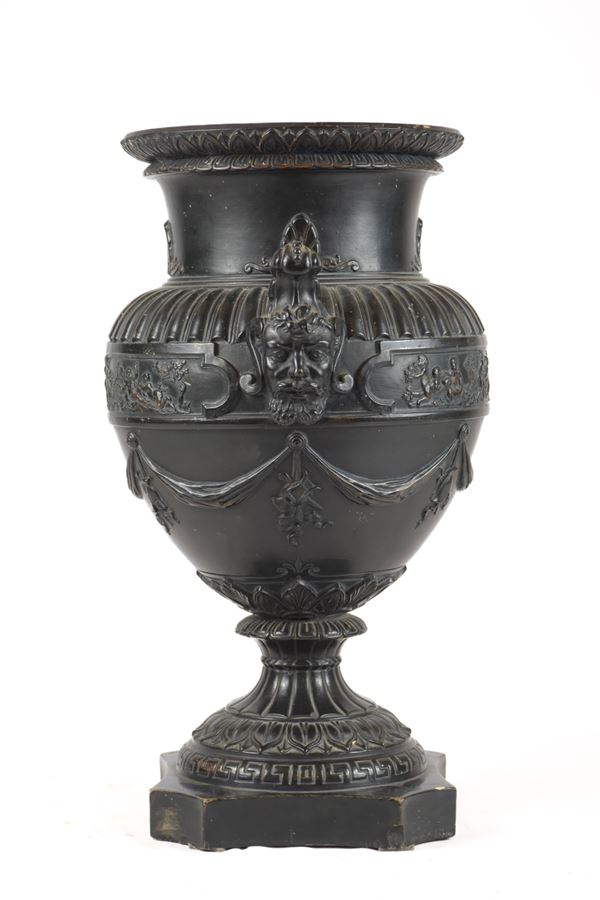 Vaso ad anfora in gesso a patina bruna. Corpo a balaustro con alto collo desinente ad orlo estroflesso. Base a pigna rovesciata su basetta ottagonale. Anse a mascheroni. Sul corpo del vaso bassorilievo con putti e festoni con ghirlande.