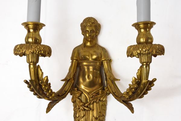 Coppia di appliques a due luci in bronzo dorato, figure muliere con due braccia reggi lampade, desinente con corpo a foglie e racemi.