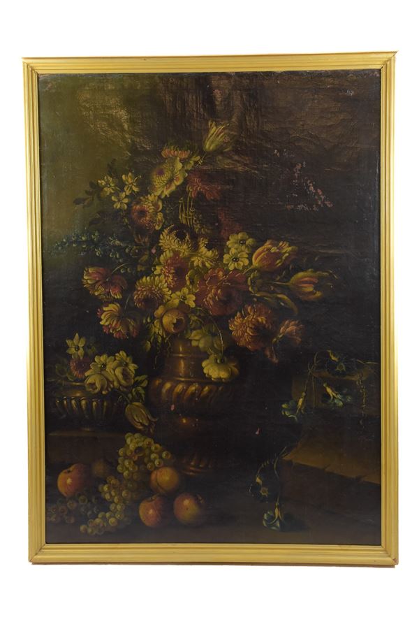 Coppia di vasi con bouquet di fiori e frutta, dipinti ad olio su tela, entro cornici in legno dorato. Diversi punti di caduta di colore sul fondo dei soggetti.