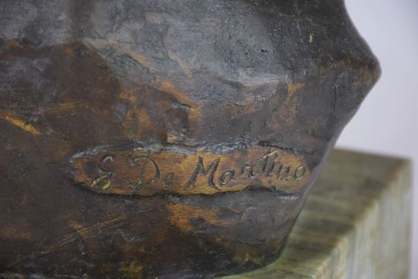 Scultura in volume, in bronzo a patina oliva, su base in marmo verde delle Alpi. Firmato a tergo, Napoli. Dimensioni base 9 x 22 x 15 cm
