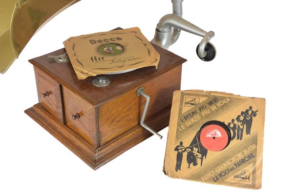 Grammofono a manovella. Cassa in legna di rovere, con campana acustica in ottone e braccio in alluminio, in lega leggera. Testina marca Paillard. Con tre dischi in vinile