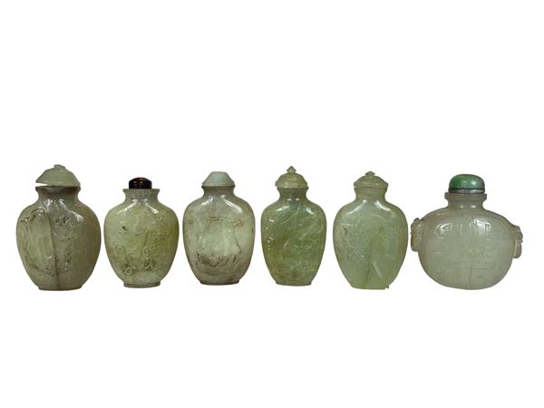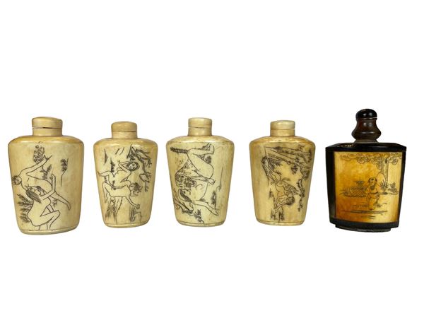 Collezione di bottiglie di forme, dimensioni e materiali differenti. Arte dell'estremo Oriente. Mancano due tappi.