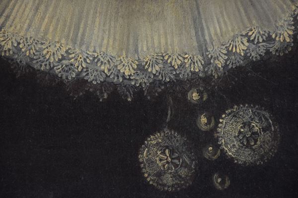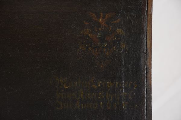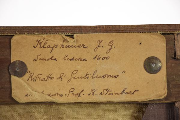 Il dipinto reca al verso cartiglio con attribuzione riferita dal Professor Kurt Steimbart (189 - 1980) a Klaphauer. Reca al fronte iscrizione e stemma nobiliare a destra.
