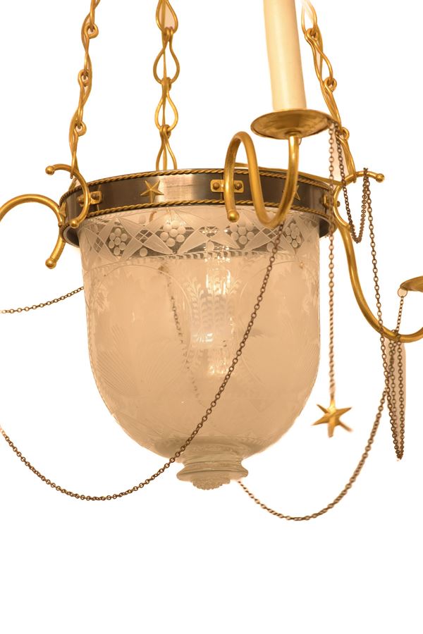 Lanterna con tre braccia e corpo centrale in vetro molato con decoro floreale. Artigianato italiano.