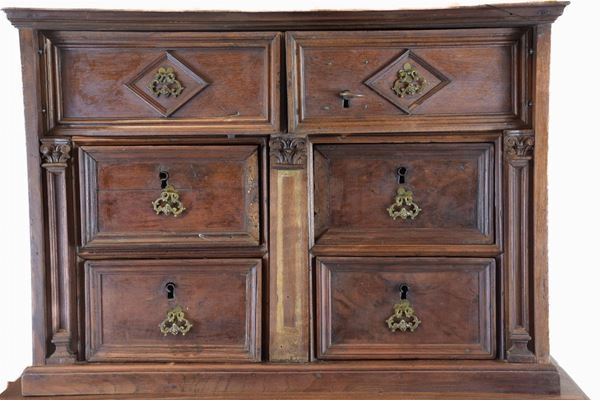 Mobile a due corpi, parte superiore in legno di noce a sei cassetti ed un ripieno con gli sportelli a vantaux. Parti scolpite e a colonne.