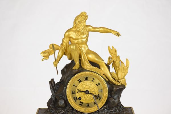 In bronzo dorato e brunito, con figuran superiore raffigurante Poseidone. Meccanica a filo revisionata e funzionante.