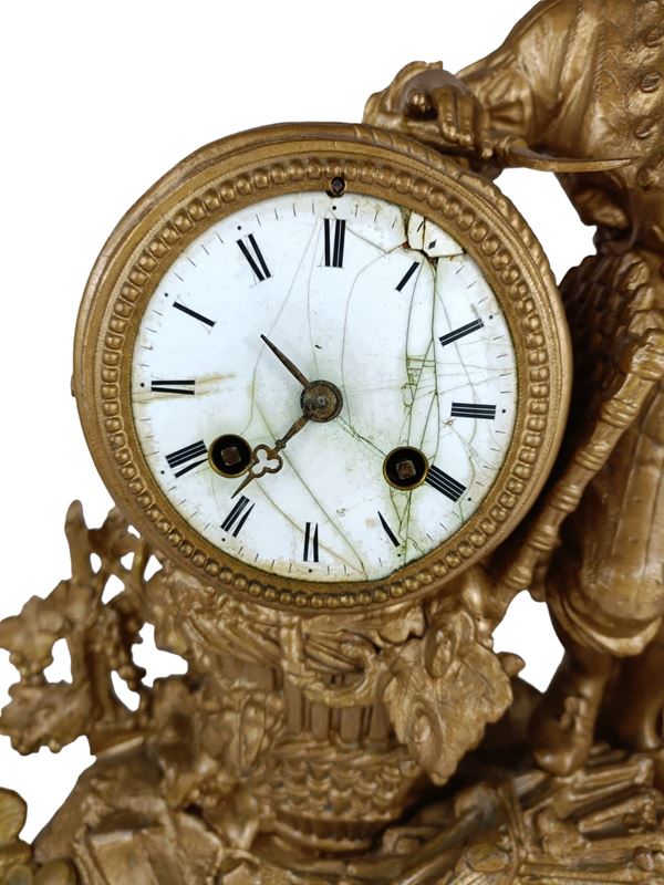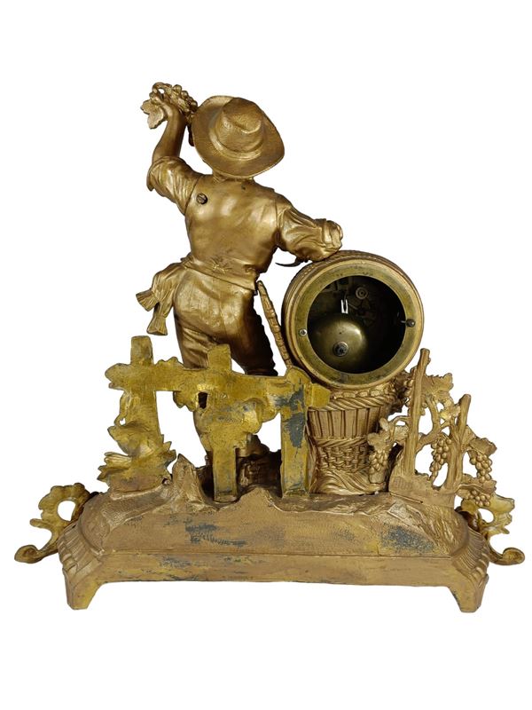 Orologio d'appoggio con meccanismo a pendolo in antimonio dorato. Con figure di fanciullo che vendemmia con botte, tralci e pampi di uva. Su basamento di forma rocailles. Quadrante dell'orologio a numeri romani con doppia carica. Braccio sinistro staccato