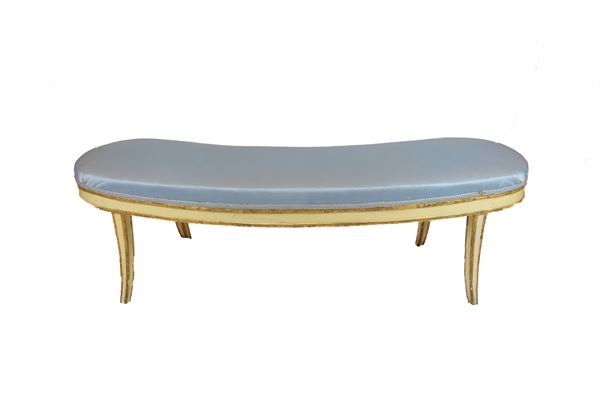 Panchetta da centro a demi lune in legno laccato e dorato. Quattro gambe d'appoggio a virgolo. Tappezzeria in stoffa blu.