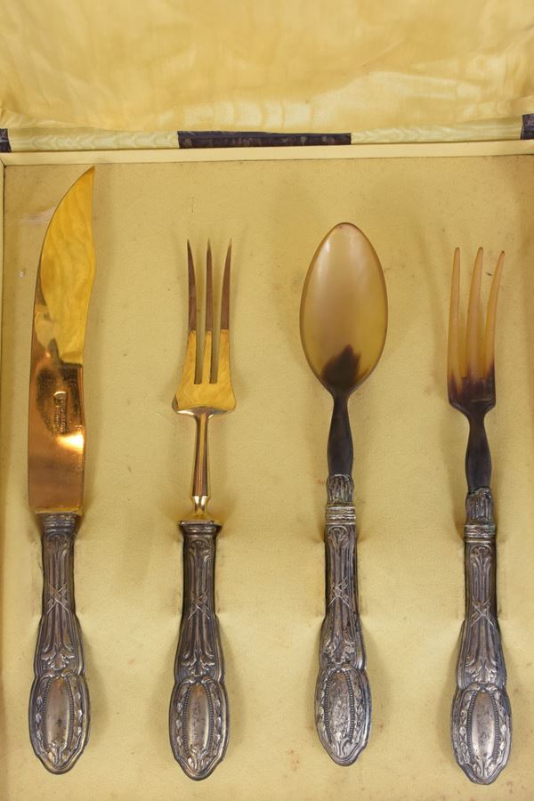 In lamina d'argento 800 su 1000 in metallo dorato con oro zecchino. Coppia di posate per l'insalata e coppia di posate per la carne. In astuccio originale. Peso lordo grammi 26.7. Gust and Wilh. Stock Solingen.