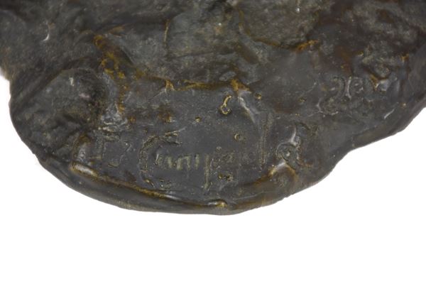 Gruppo scultura in volume su base rocciosa. Firmato a destra sulla base, mancante il mignolo sinistro della baccante.
