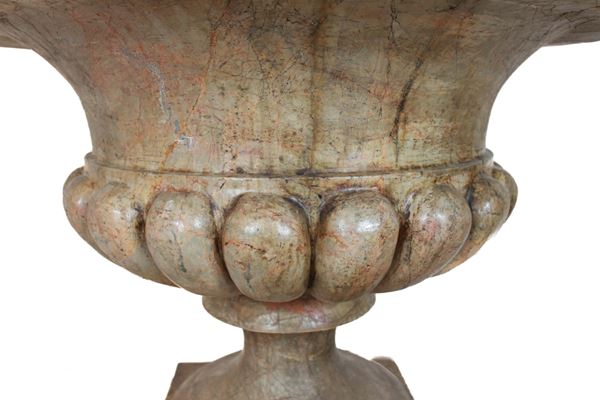 Scultura in volume, corpo a costoloni e piede a calice. Orlo svasato con centina apicale. In breccia delle alpi. Parti restaurate.