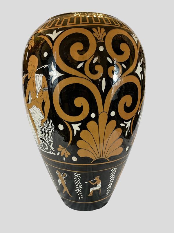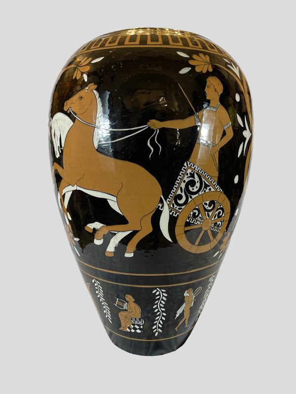 Vaso in ceramica con decorazione su due registri: a scene di cavalli e personaggi, in nocciola e bianco su fondo nero, nella parte superiore; con danzatrici e suonatori ripartiti da tralci di foglia in quello inferiore. Produzione italiana, tratta dai modelli ispirati dall'Antico