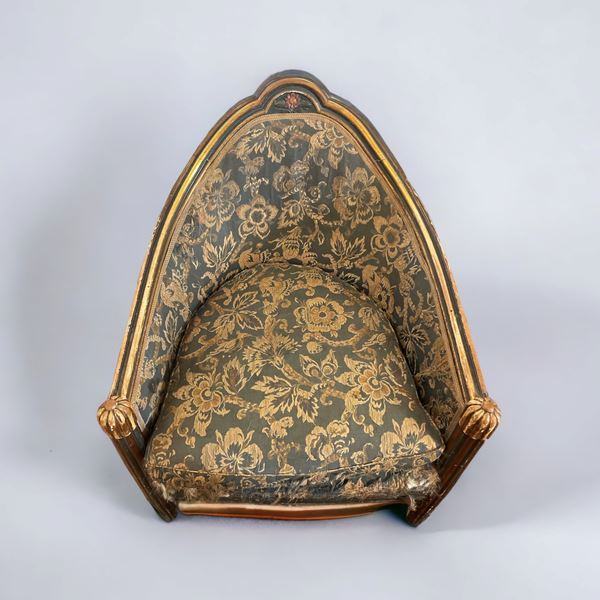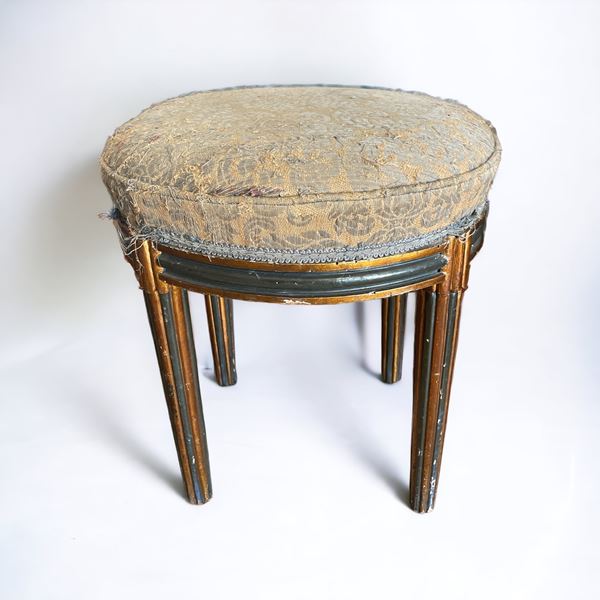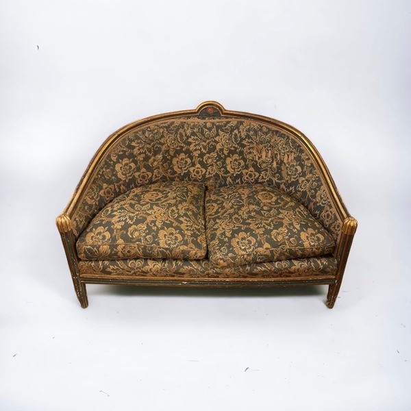 composto da un divano a due posti, coppia di poltrone e coppia di pouff. In legno laccato verde e dorato. Tappezzeria da sostituire.