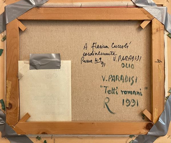Firmato in basso a destra. Reca iscrizione a retro: dedica, firma, titolo e data. In cornice.