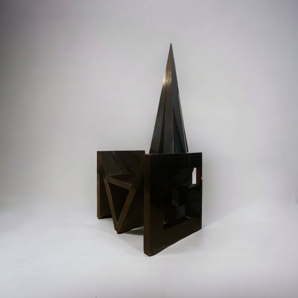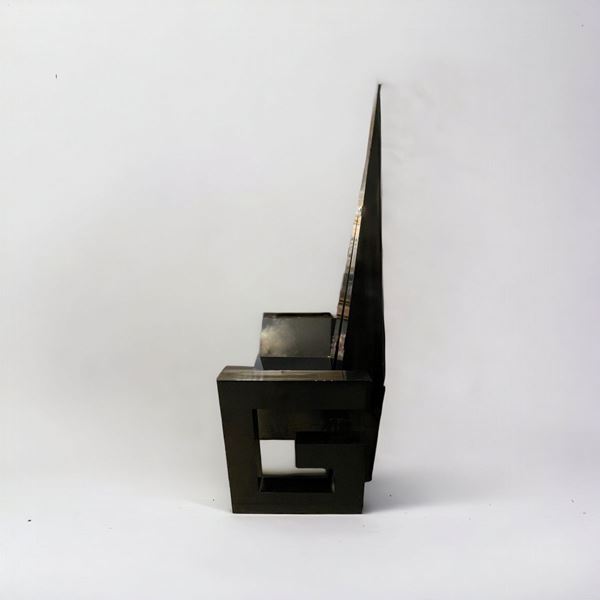 In legno laccato nero. Base e fianchi stilizzati in maniera geometrica con la "V" di Versace. Schienale alto a cuspide. Piccola rottura sotto il bracciolo destro.