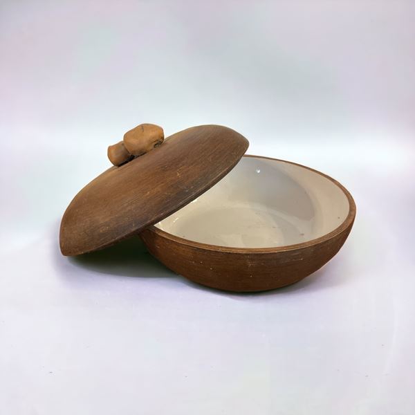 Ciotola con coperchio in ceramica realizzata dalla ditta Zaccagnini quando la direzione della ditta fu affidata al maggiore dei figli di Ugo, ovvero Urbano Zaccagnini. L'interno è bianco smaltato e l'esterno è marrone, sopra il coperchio, al centro, decorano l'oggetto due patate in ceramica. Firma sul fondo della ciotola. Epoca, anni '50.