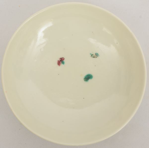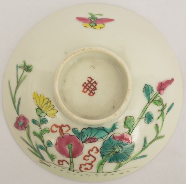 In porcellana policroma decorata con fiori e animali. Marchio alla base. Difetti.