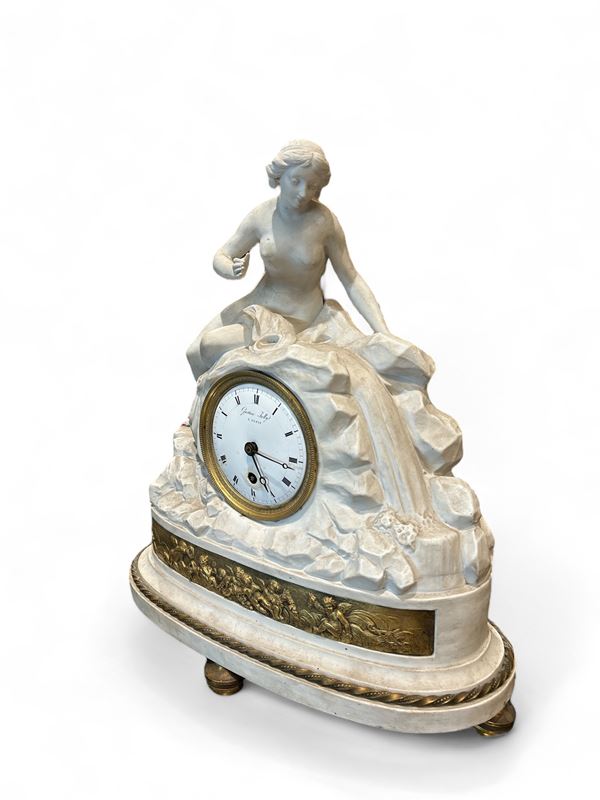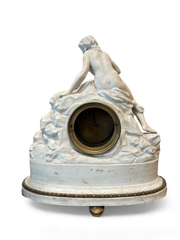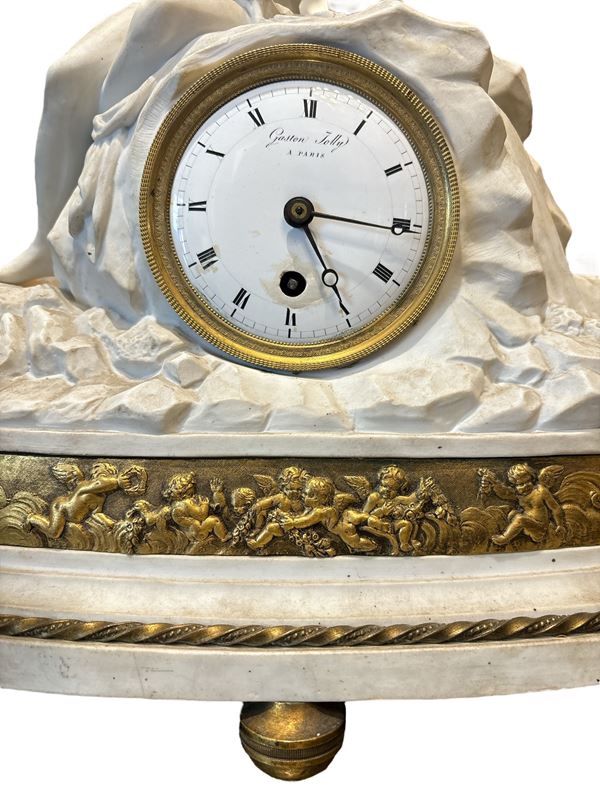 Orologio da tavolo in porcellana di Biscuit, fascia in bronzo dorato, firmato Gaston Jolly à Paris. Quadrante in rame sbalzato, numeri romani, movimento a filo, suoneria ore. Manifattura francese. Mancanze.
