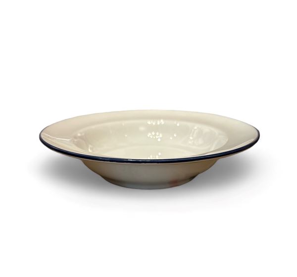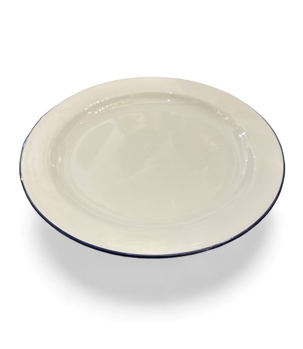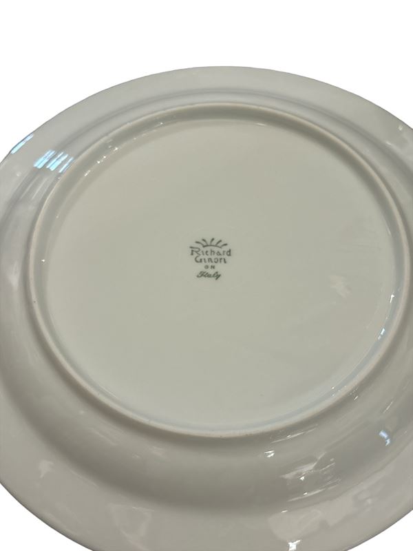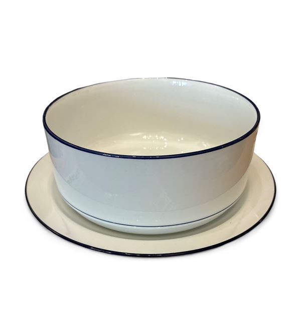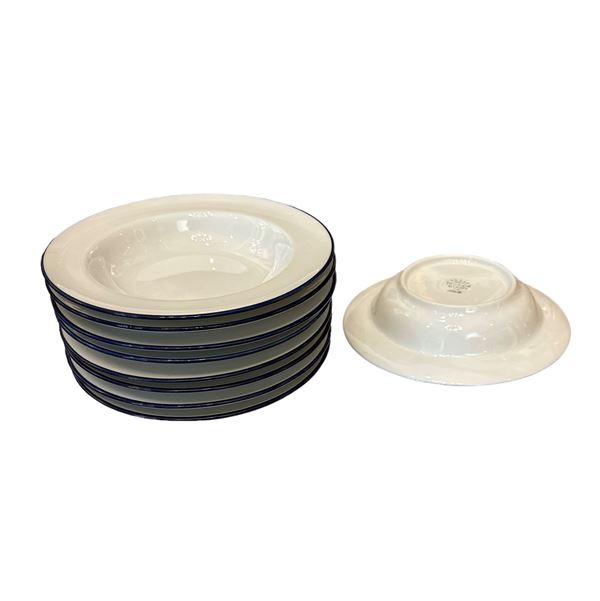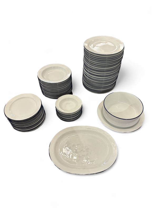 Bianco con bordo esterno blu. Composto da 27 piatti piani, 13 piatti fondi, 13 piatti da dessert, 9 coppette, 1 vassoio (larghezza 34,5 cm), 1 piatto da portata rotondo (diametro 28 cm), una grande ciotola ( diametro 21,5 cm). Un piatto piano sbeccato.