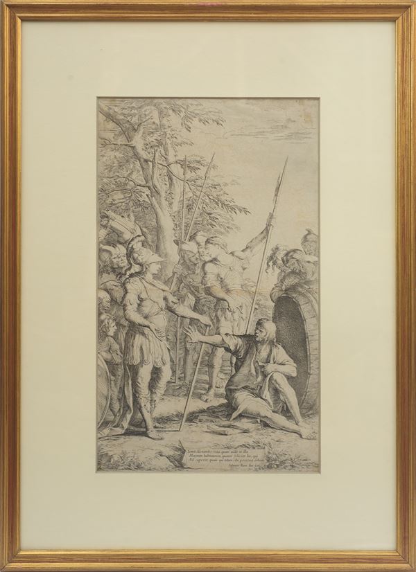Esemplare appartenente al secondo stato, con l'orecchio di Diogene cancellato e con l' aggiunta del tratteggio sul volto del ragazzo a sinistra. Rifilato alla linea di inquadramento. In cornice.
