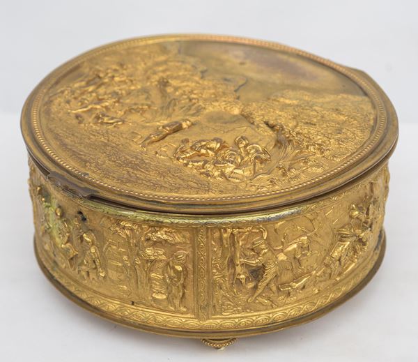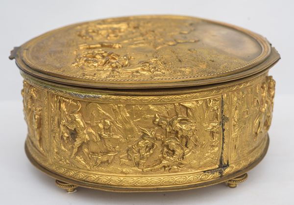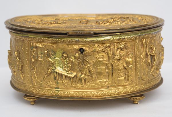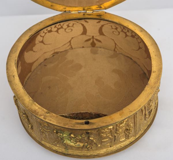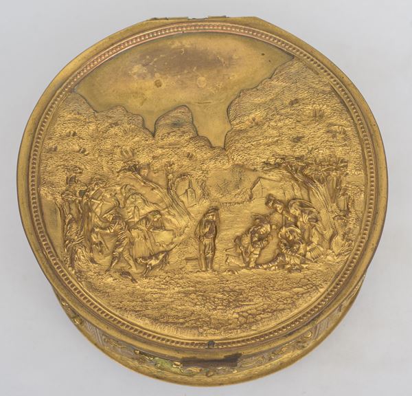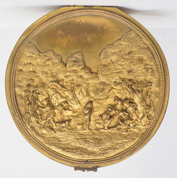 In bronzo dorato, cesellato e sbalzato a motivi di paesaggi e feste campestri. Difetti e restauri.