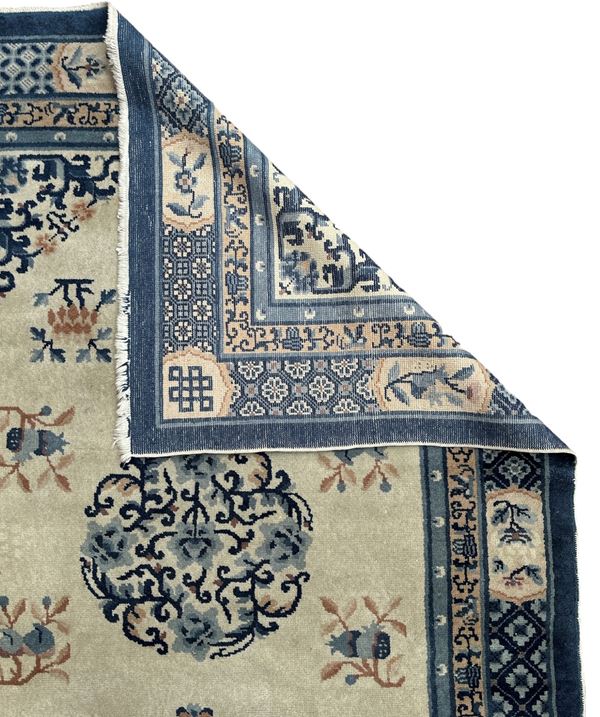 a decorazioni floreali e geometriche, a fondo avorio e bordature blu