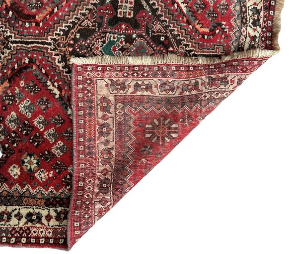 a fondo rosso con due medaglioni centrali e bordatura avorio con cartigli