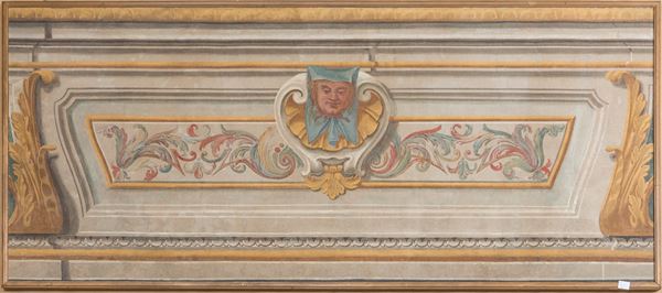 con decorazioni a ghirlande floreali e mascherone centrale. In cornice a bacchetta.