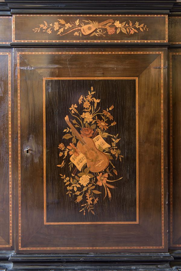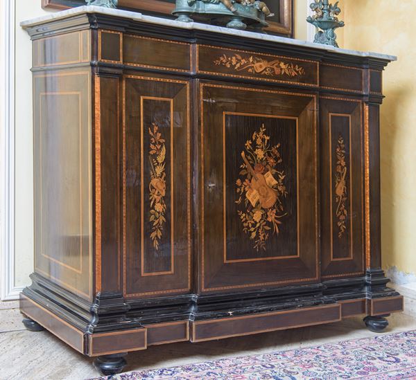 In legno di palissandro intarsiato con legni vari di frutti a decorazioni floreali e strumenti musicali, cornici ebanizzate e piano superiore in marmo bianco.