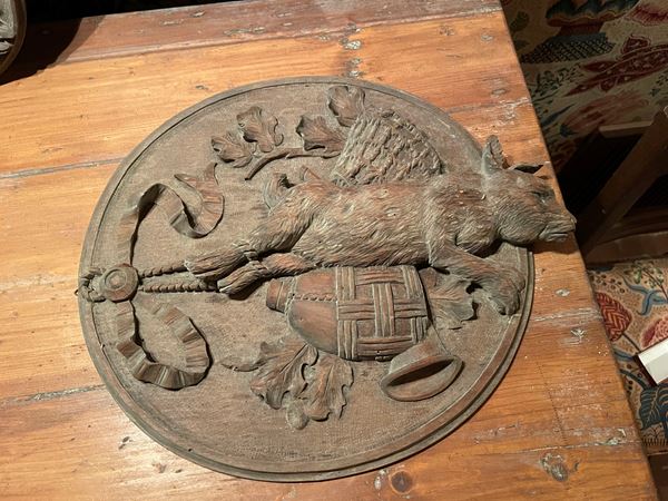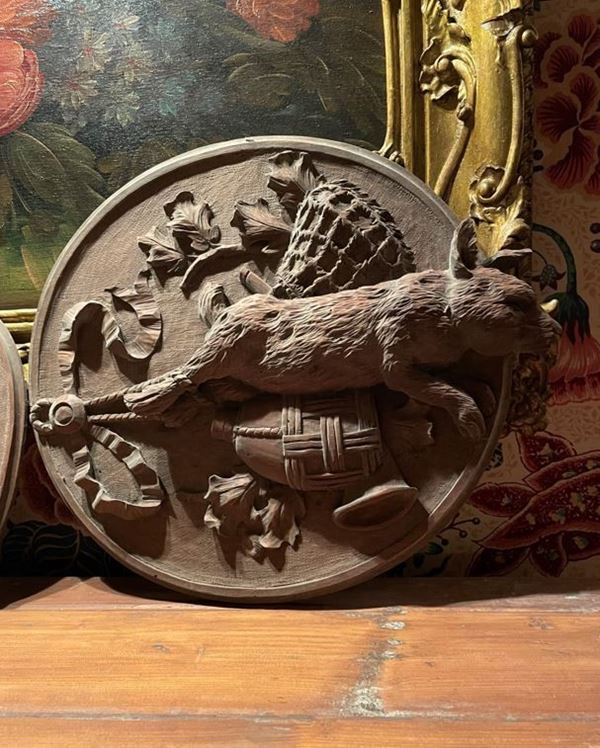 in legno scolpito raffiguranti cacciagione. Dimensioni: D 38 cm; D 21 cm.