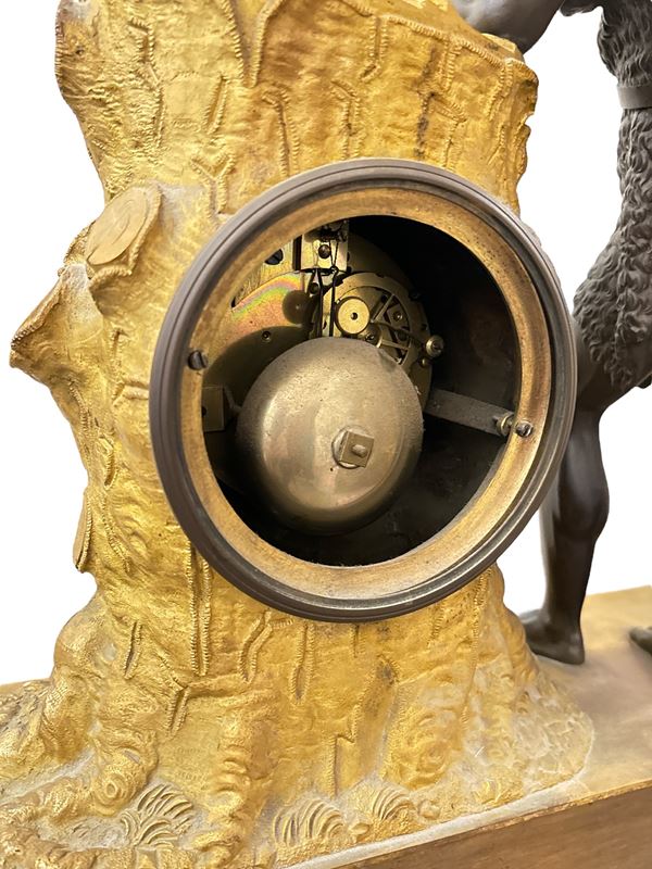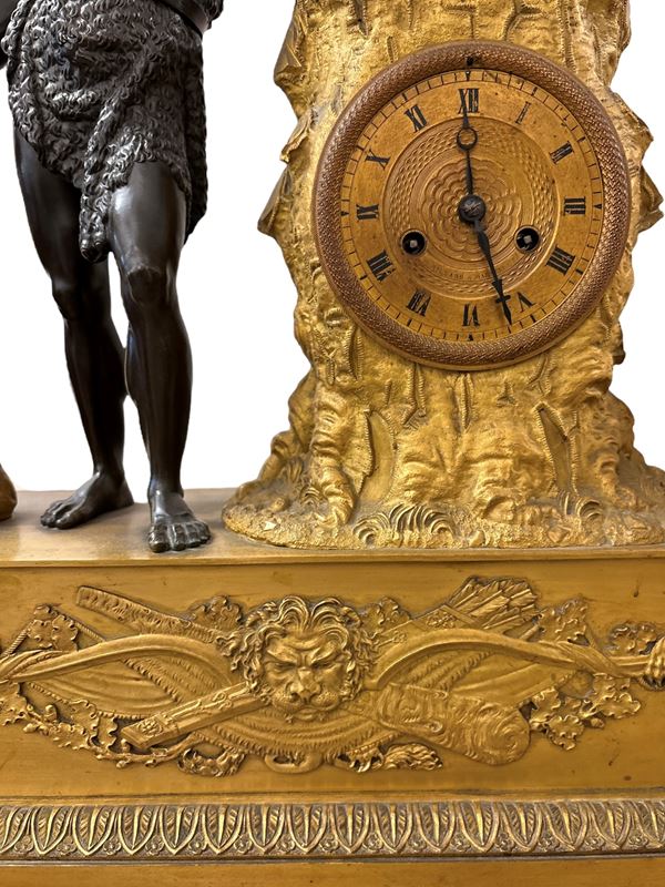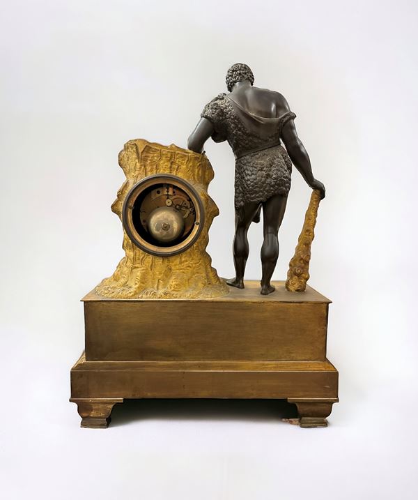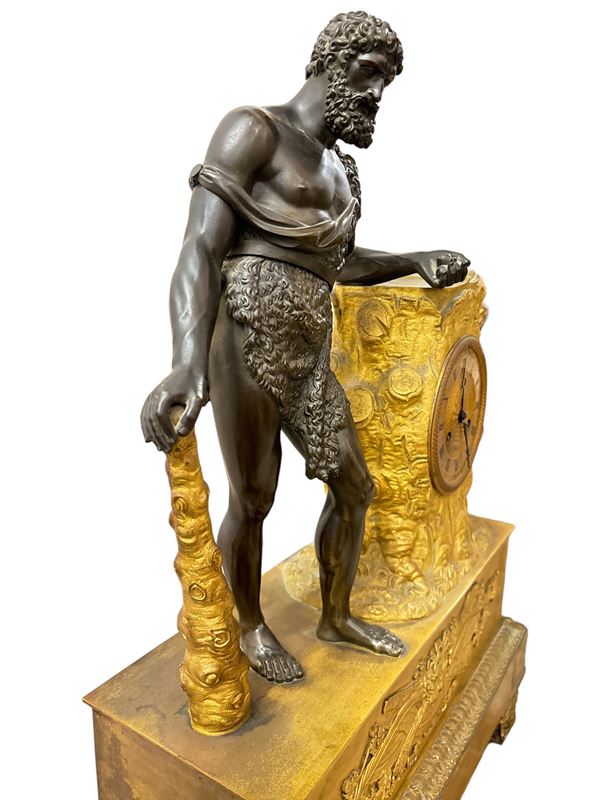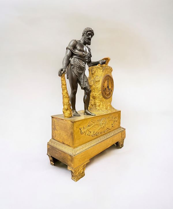 in bronzo dorato e brunito, finemente cesellato. Con scultura raffigurante Ercole poggiante su una rocailles. Manifattura francese. Meccanica a filo con suoneria ad ore e mezzore da revisionare.