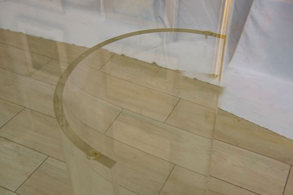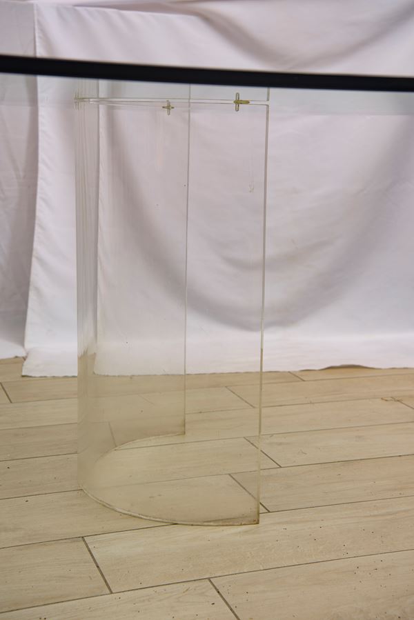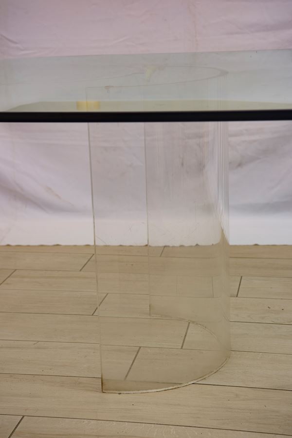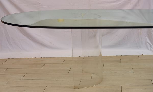 Nello stile di Gallotti e Radice. Il piano, di grande spessore, misura 15 mm. Con basi ellittiche in vetro curvato.