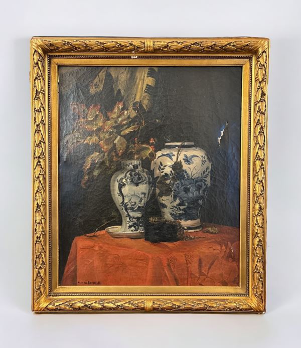 Firmato in basso a sinistra. Entro cornice. Fenditura e difetti alla tela.