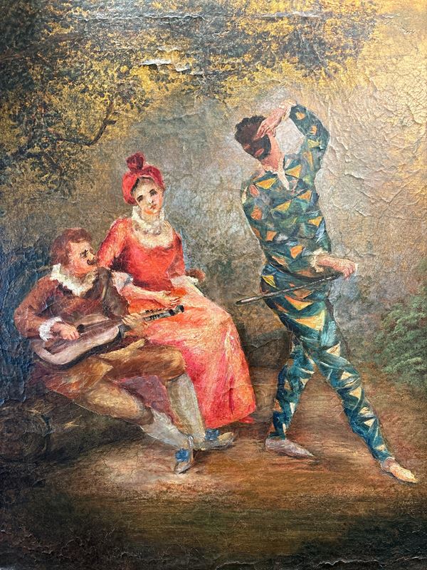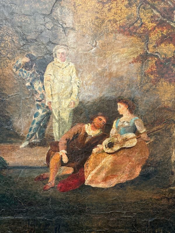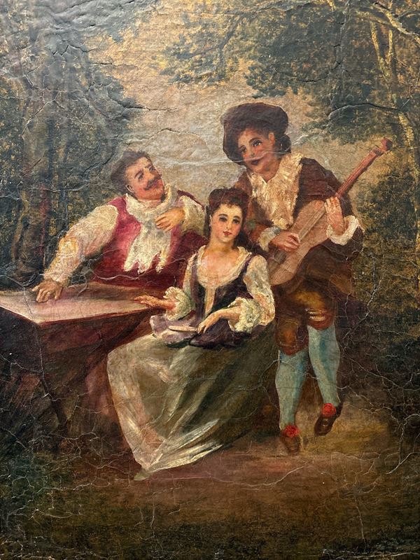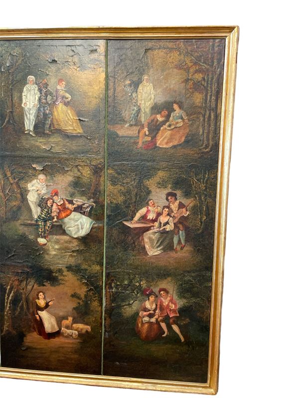 composto da quattro ante dipinte ad olio su tela raffiguranti scene galanti tratte da Nicolas Lancret. Restauri, mancanze e sollevamenti. Entro cornice in legno dorato. Manifattura francese