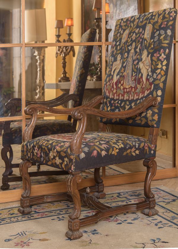 in legno di noce con tessuto ricamato. Stile rinascimentale.